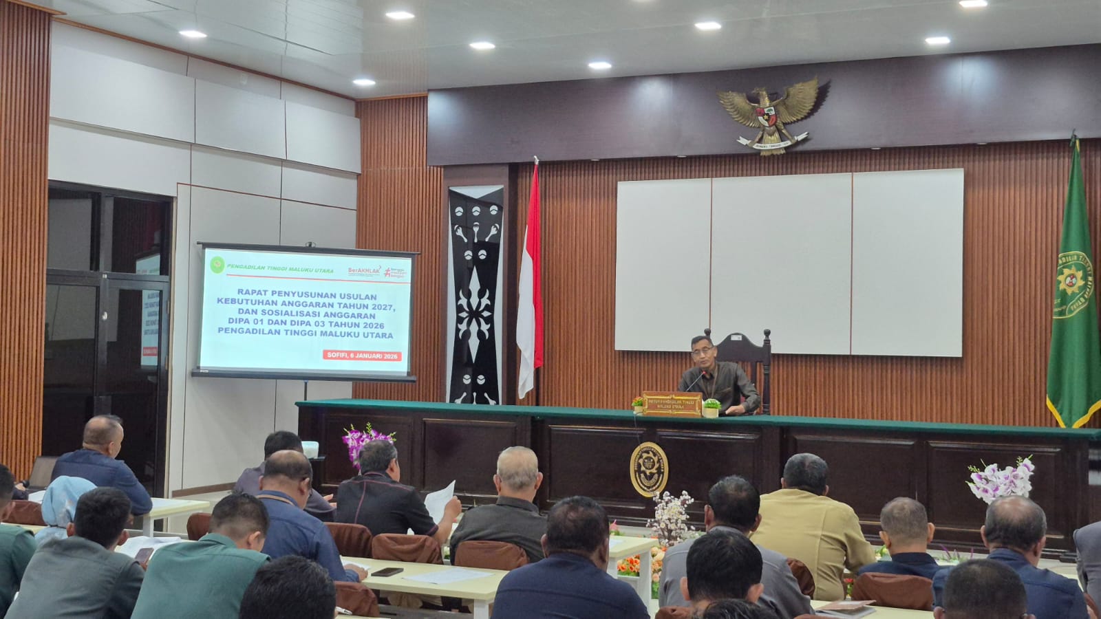 Sofifi - Pengadilan Tinggi Maluku Utara melaksanakan rapat penyusunan usulan kebutuhan anggaran Tahun 2027 yang dirangkaikan dengan sosialisasi anggaran DIPA 01 dan DIPA 03 Tahun 2026, pada Selasa, 6 Januari 2025, pukul 10.00 WIT, bertempat di lingkungan Pengadilan Tinggi Maluku Utara.